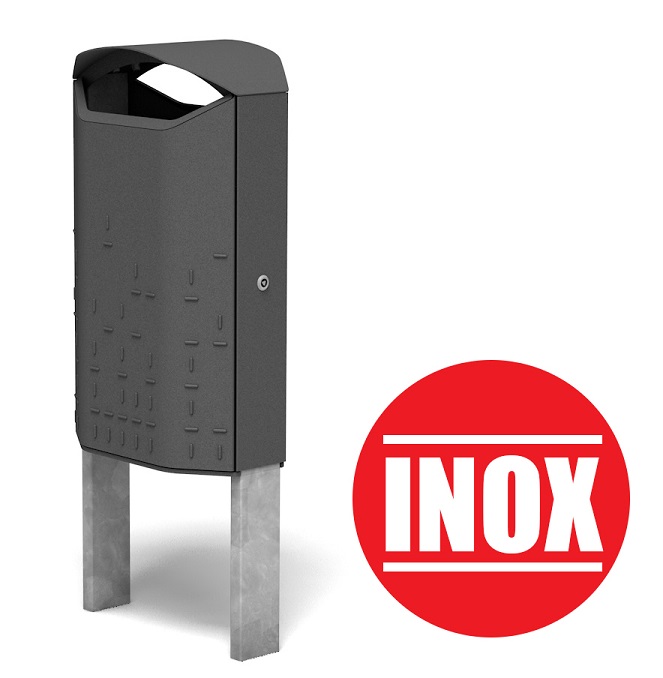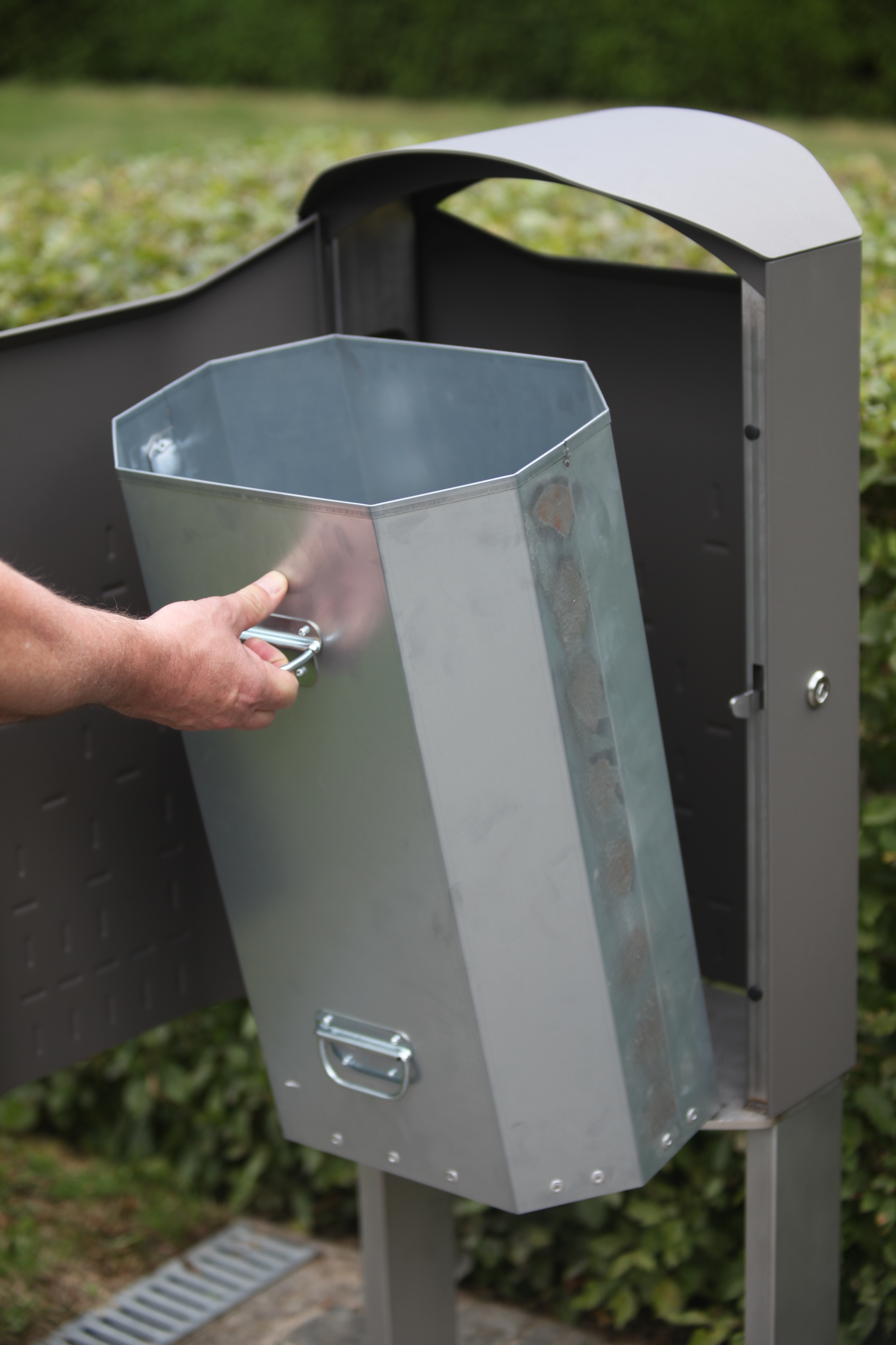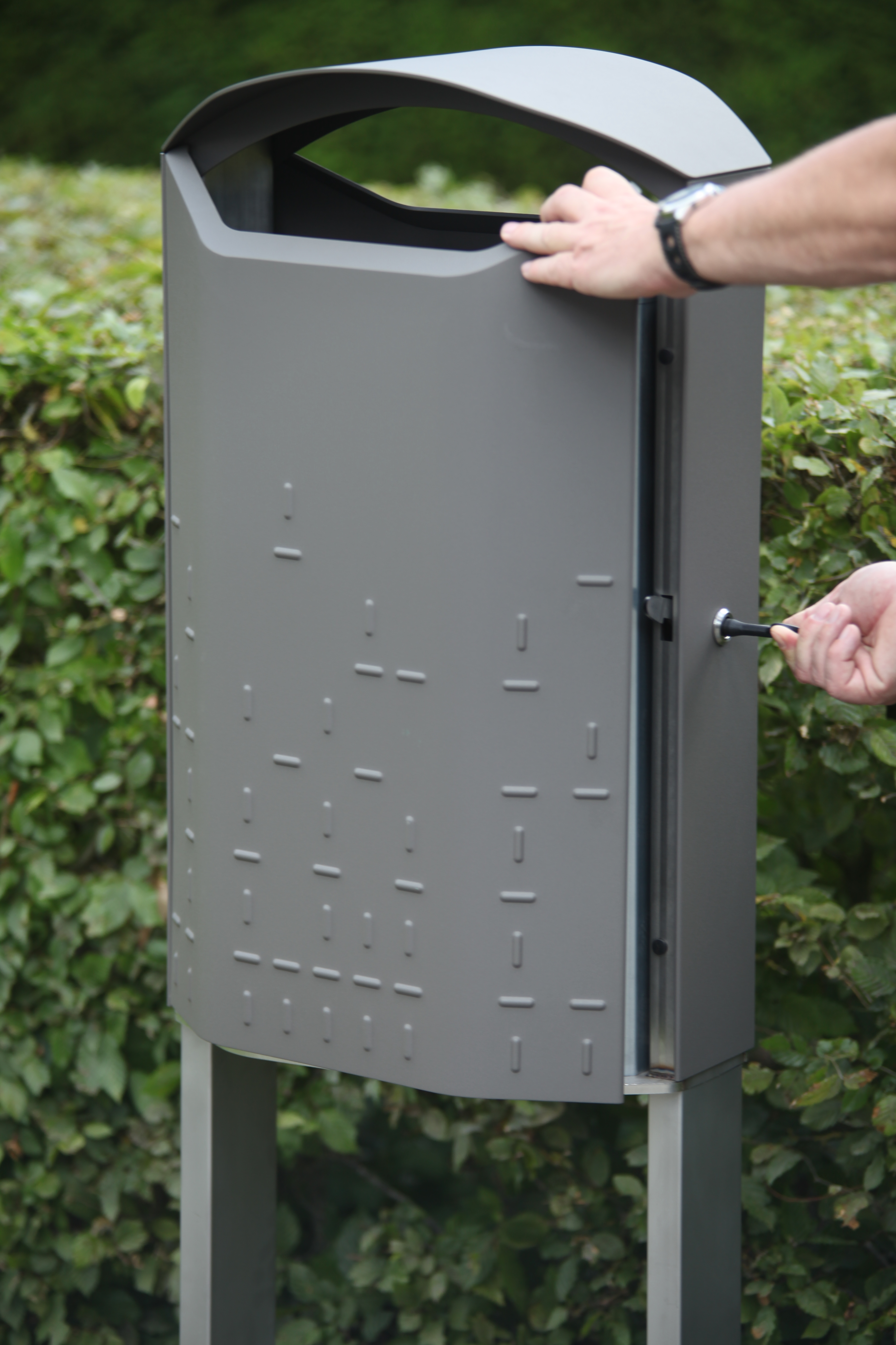 - La poubelle (50L) est fournie avec 1 bac intérieur (acier standard Magnelis) et 1 porte, la porte est fournie en standard avec une serrure simple avec fonctionnement par une serrure triangulaire en acier inoxydable de 8mm.