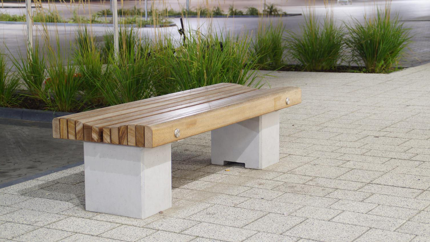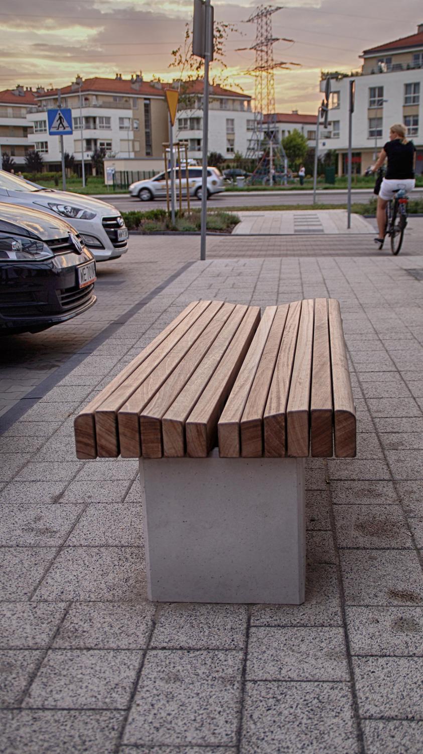 Ce banc autoportant 19-02-75 est doté d'une surface d'assise inclinée et extrêmement confortable en bois dur tropical IROKO et d'une base robuste en béton lisse. La fixation est en acier inoxydable 304.