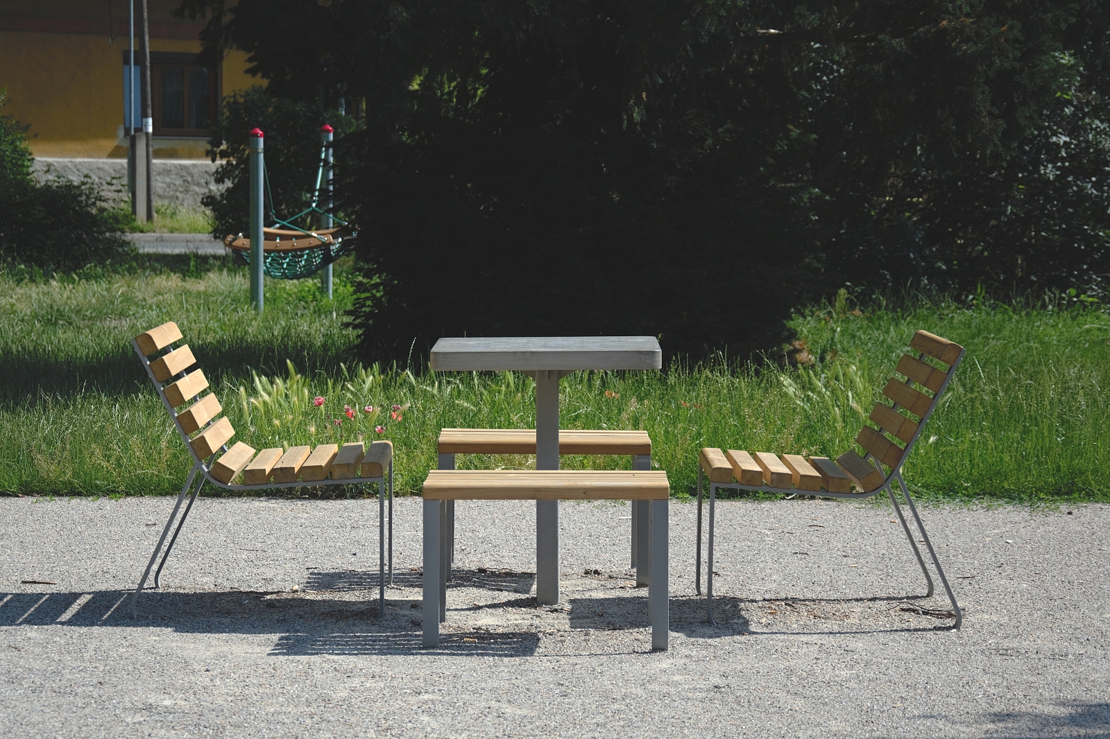 La structure de support en acier est traitée avec un revêtement en poudre. Le plateau de la table est un panneau de béton bicolore fermement ancré au pied central. Dans la partie inférieure du pied se trouve une plaque avec des trous pour l’ancrage à la base.