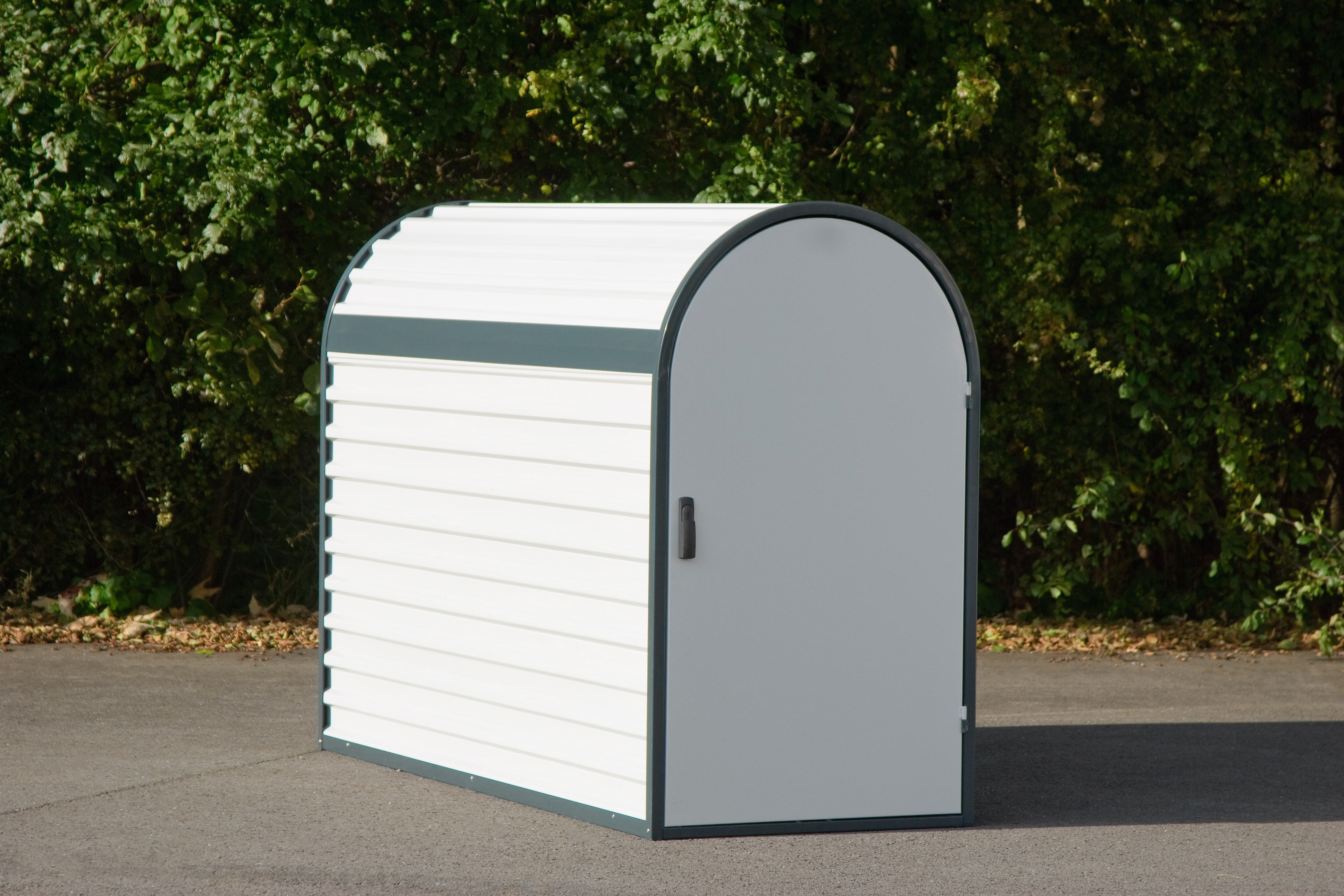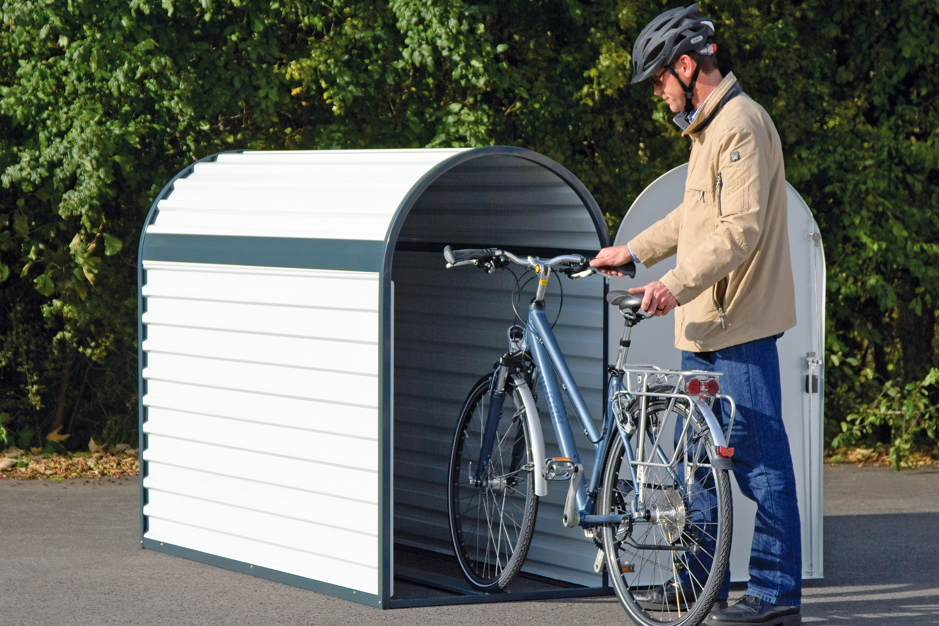 Notre BikeBox 3. Le coffre à vélos en tôle d'acier particulièrement robuste et résistant à la corrosion protège les vélos, vélos électriques et vélos électriques «normaux» et en particulier de haute qualité contre les intempéries, le vol et le vandalisme. Idéal pour les entreprises, les hôtels et les chambres d'hôtes, les campings, les complexes résidentiels, les ménages privés ou les stations de vélo et de vélo. La BikeBox 3 dispose d'un verrou de sécurité spécial et d'une barre de stationnement pratique.
