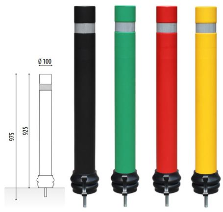 Flexibele polyurethaan bollard met zwarte plastic basis om in de grond te schroeven, na het ontvangen van een impact keert het terug naar zijn oorspronkelijke vorm en positie. De paal is praktisch onverwoestbaar. Speciaal ontworpen basis voor onze Flexibele paal met centrale schroef. Eenvoudige installatie omdat er slechts één schroef in de vloer hoeft te worden geschroefd, zonder dat de eigenschappen van de bollard verloren gaan.