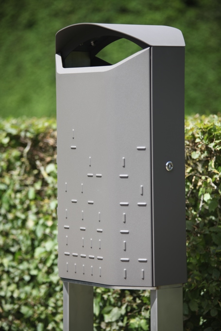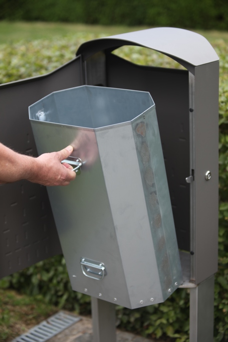 - Een optionele verwijderbare asbak geïntegreerd in de werpopening kan voorzien worden op vraag van de klant. Deze is ook vervaardigd uit RVS en vangt de sigaret op die eventueel nog niet gedoofd is maar kan dan op zijn eigen uitdoven in dit apart compartiment. Daarna kan de asbak eenvoudig leeggemaakt worden in de grote bin vanvoorzien worden door opdruk of de afvalbak. Er is ook een asbak beschikbaar aan de buitenkant voor de grotere opvang aan sigaretten peuken.
