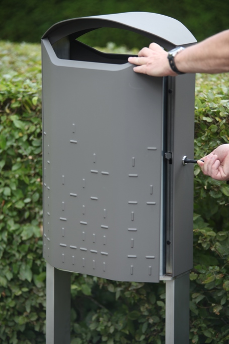 - De deur en achterkant van de afvalbak kan voorzien worden van noppen voor aanplak affiches tegen te gaan. Dit is standaard voorzien.