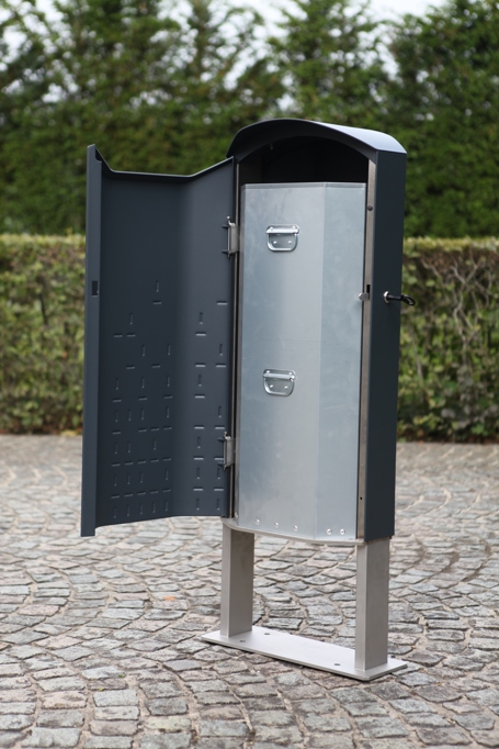 - De afvalbak (50L) is voorzien van 1 binnenbak (standaard Magnelis staal) en 1 deur, de deur is standaard voorzien van een enkele sluiting met bediening door een rvs driehoekslot van 8mm.