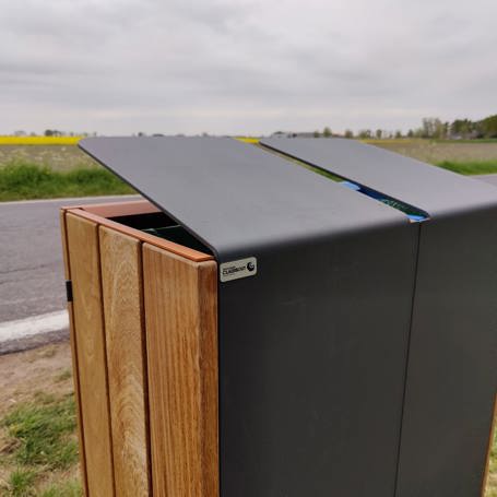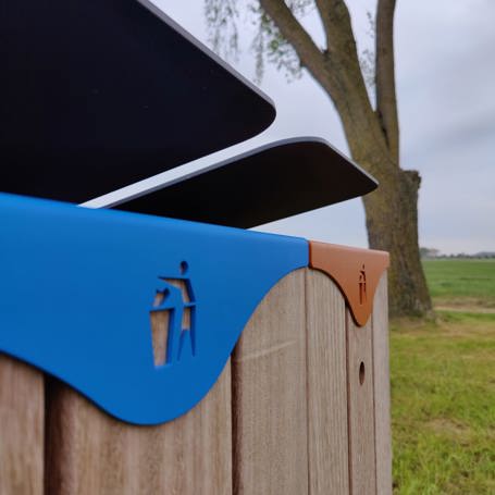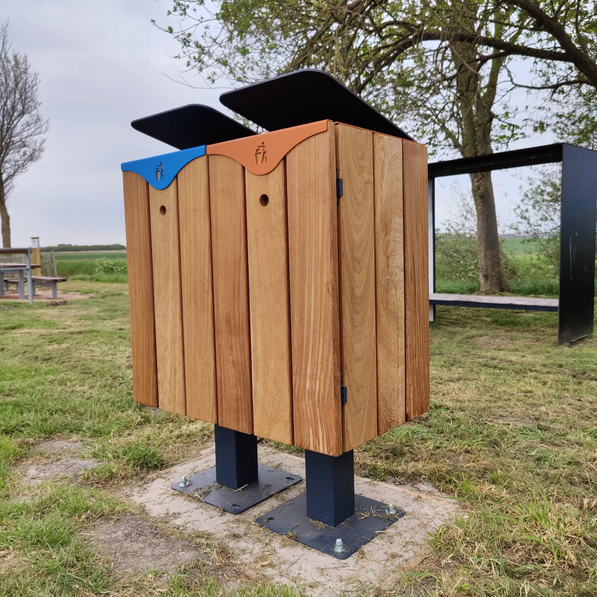 - Hout bekleding: De afvalbak is voorzien aan de zijkanten en de deuren van tropisch hardhout
