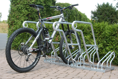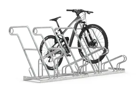 Fietsenrek voor 2 fietsen hoog/laag met stevige aanleunbeugel waar de fiets aan een ring kan vastgelegd worden door een fietsslot.