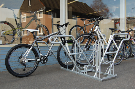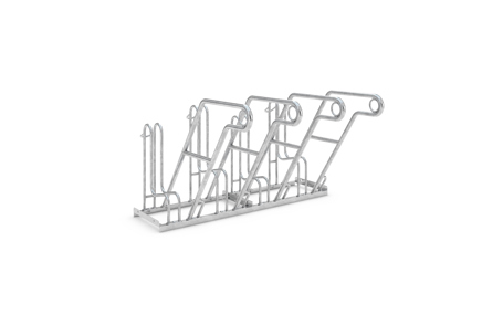 De in de framehouder geïntegreerde ronde stalen ogen maken het vergrendelen en ontgrendelen bijzonder eenvoudig en veilig. Wielhouders zijn speciaal hoger gemaakt voor een optimale wielondersteuning. Hoog/laag zodat de fietsen compact kunnen worden geparkeerd.