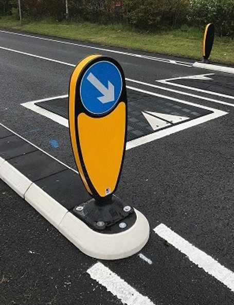 Volledig in plastiek, recycleerbaar, veilig, zelf oprichtbaar en met pijl 'BLIJF RECHTS' rijden.