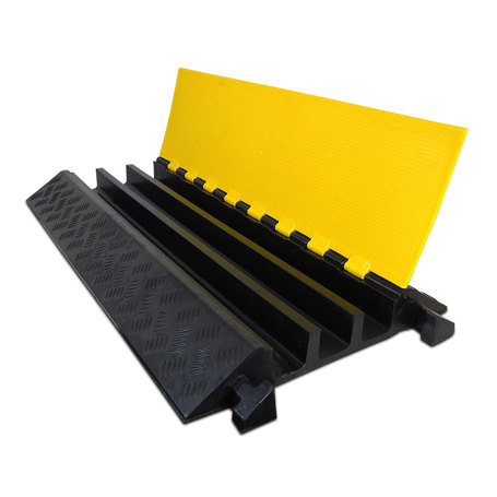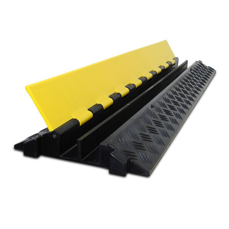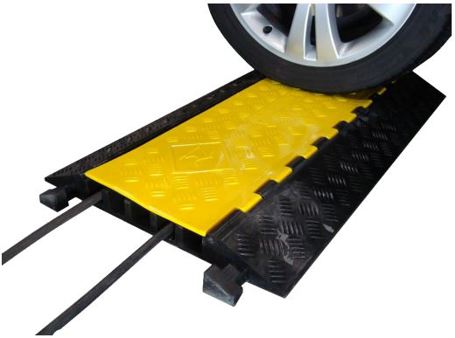 De kabelbeschermers zijn vervaardigd uit zwart rubber voorzien van een geel PE deksel met anti-slip laag.