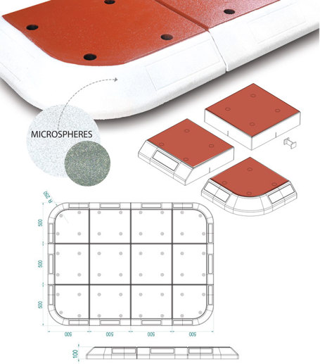 Het verkeerseiland bestaat uit losse elementen en kan daardoor gebruikt worden voor verschillende situaties. Perfect om in het straatbeeld te plaatsen als vertraging of sensibilisering, om het verkeer te vertragen en eventuele zwakke weggebruikers te beschermen. De modules zijn vervaardigd uit gevulkaniseerd rubber. Ze zijn te verkrijgen in zwartgrijs of rood/witte kleur. De modules zijn voorzien van witte reflecterende zijkanten. De afmetingen van een module is 500 x 500 x 100 mm (bxdxh). De modules zijn te verkrijgen in 1/2 rond kopstuk, zij-element en middenelement. Het grote voordeel is dat het eiland in elke gewenste afmeting kan opgebouwd worden.