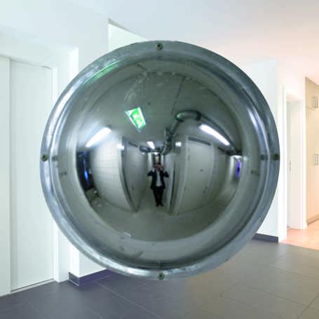 Vandalismebestendige bolspiegel van zelfdovend slagvast polycarbonaat voor montage in garages, brandgangen, trappenhuizen, liftuitgangen. Montage aan plafond, in hoeken en aan muren. Ook zeer geschikt voor instellingen, ziekenhuizen, gesloten inrichtingen. Gecertificeerdvolgens SKG KE572.