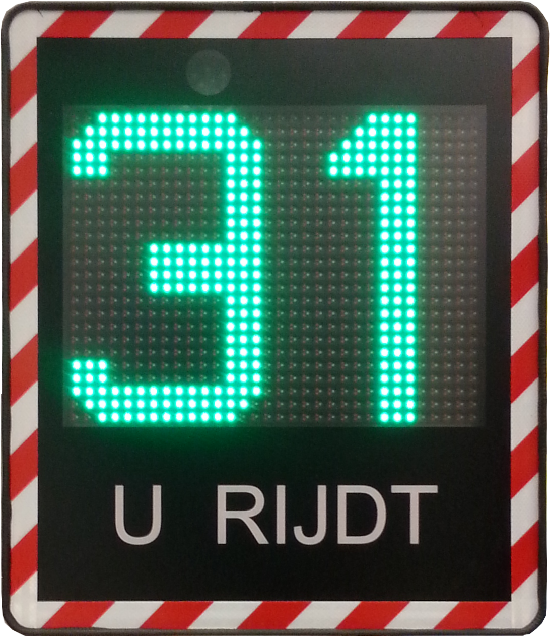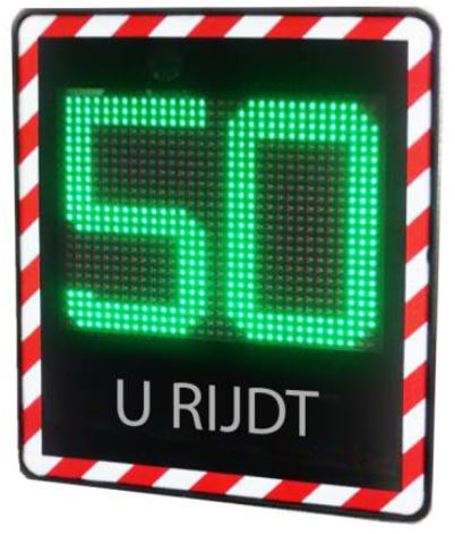 Hij wisselt driekleurige 39 cm grote cijfersnelheidsdisplay af met pictos die het gedrag van de verbruiker weergeven.