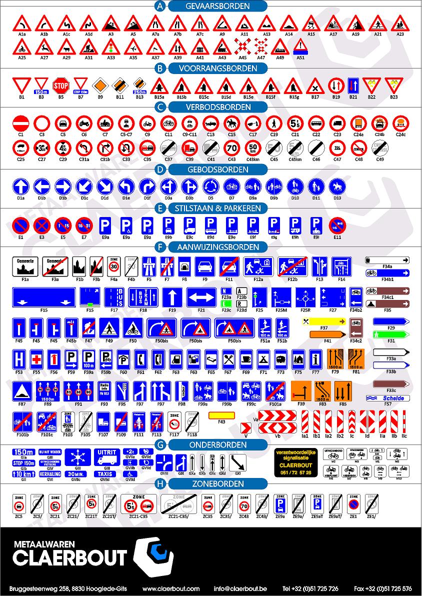 Onze verkeersborden zijn volgens het standaard bestek type 250 voor de wegenbouw versie 3.1 van de Vlaamse Overheid. U kan bij ons terecht voor standaard verkeersborden en op maat gemaakte borden. Ook alle toebehoren zoals de palen en de beugels zijn bij ons te verkrijgen.