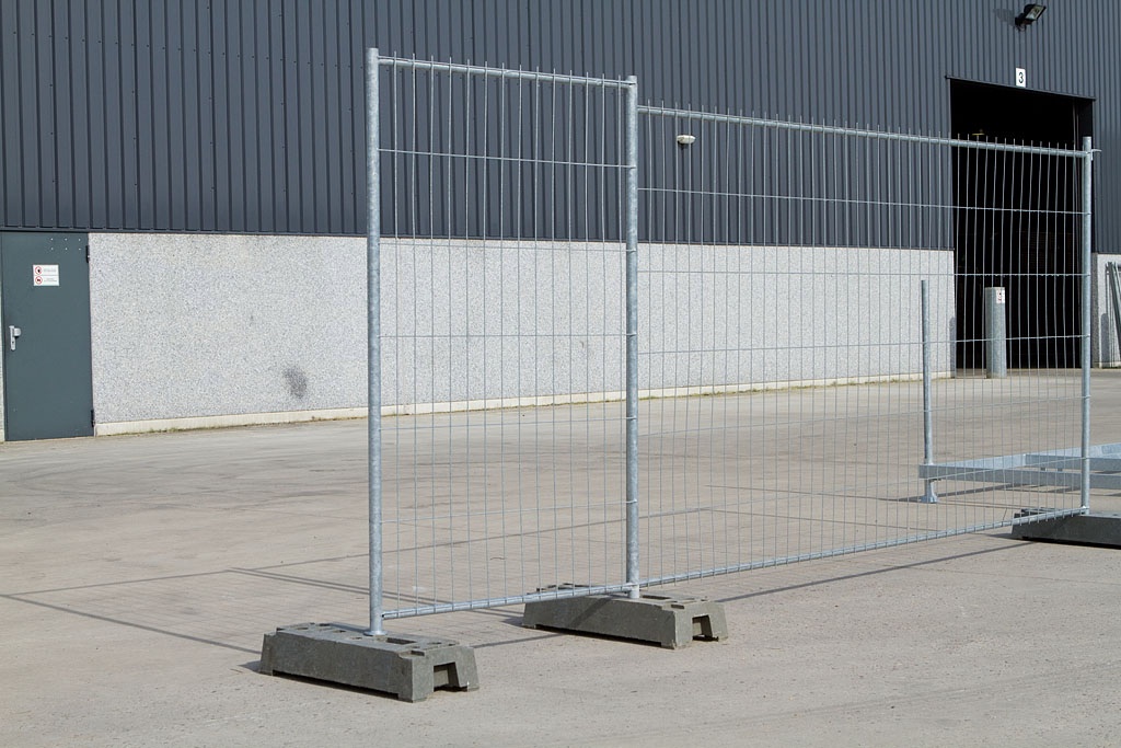 Een voorverzinkt bouwhek met 4 verstevigingshoeken. Een goede, sterke begrenzing van een bouwwerf waar veiligheid voorop staat.