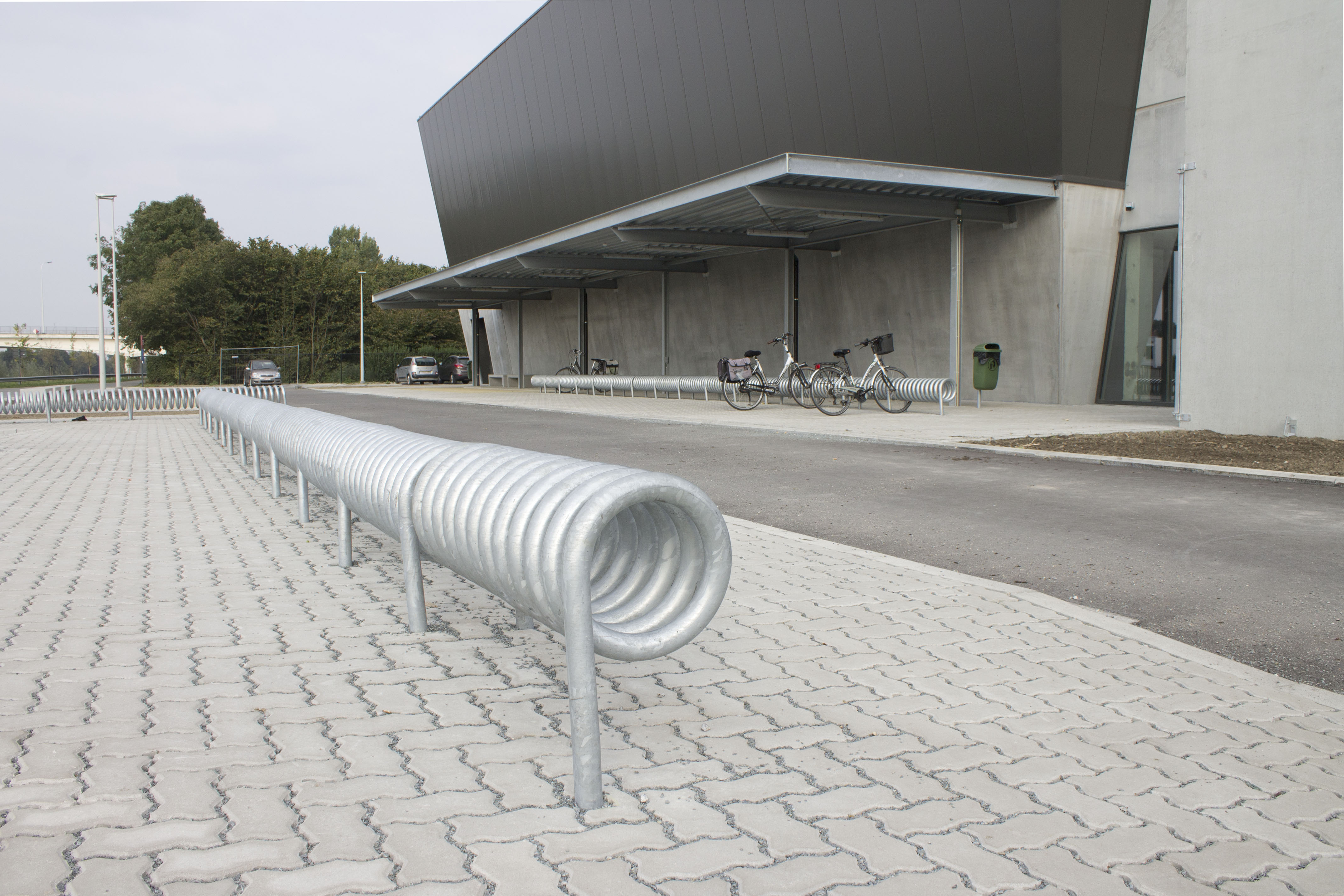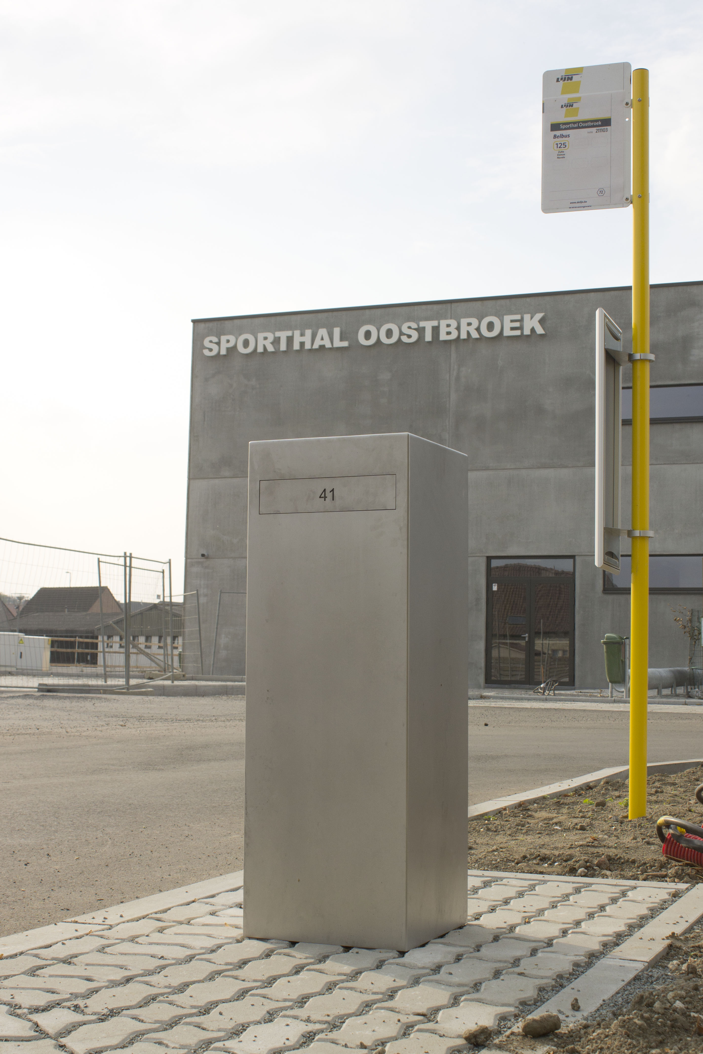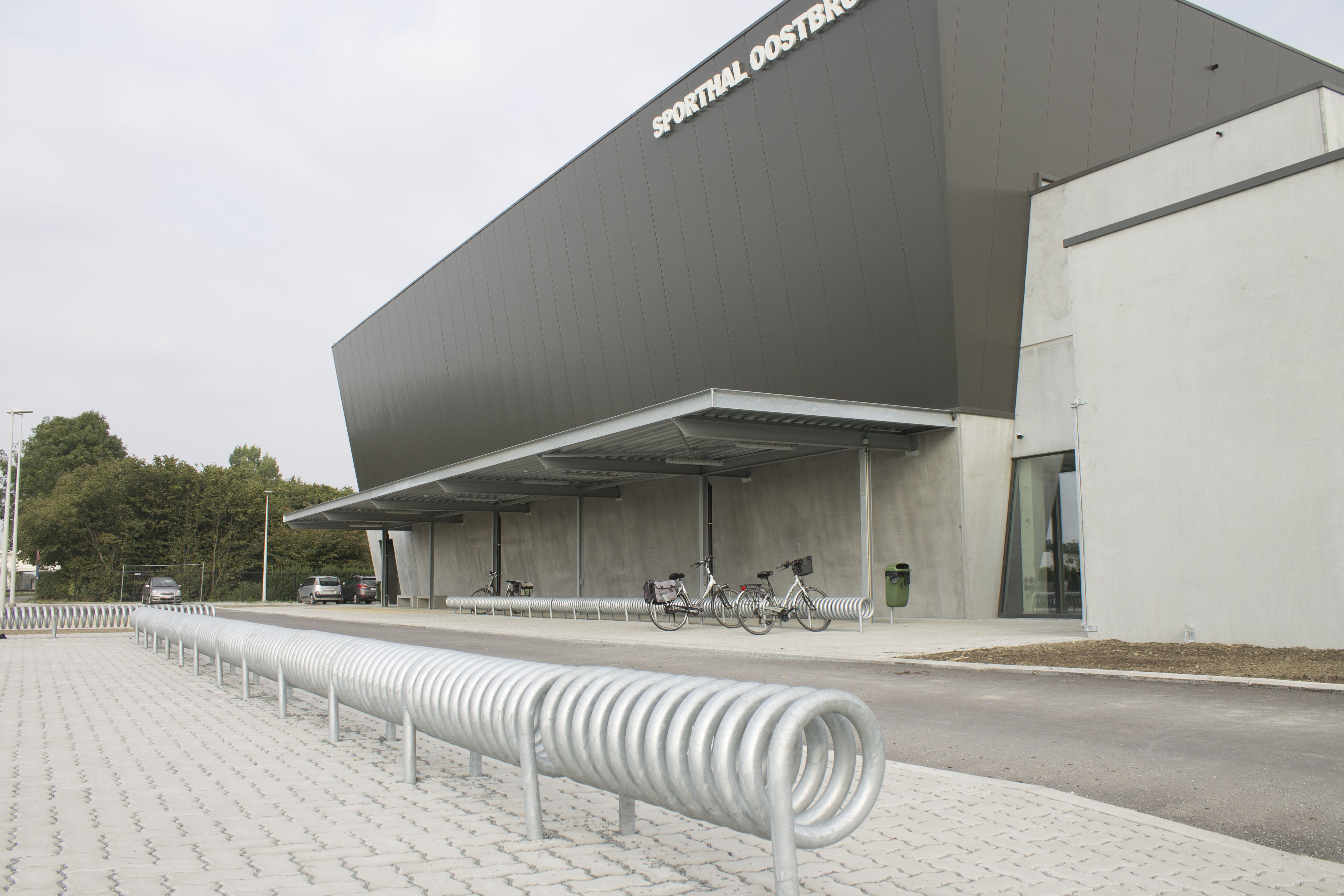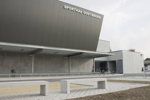 Leveren van zitbanken, fietsspiralen en afvalbakken voor Sporthal Oostbroek te Nevele.