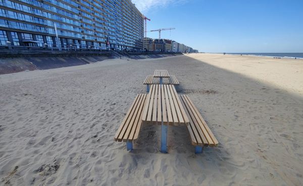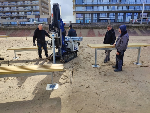 Voor het project op het strand van Oostende hebben we met trots picknickbanken van ons Westtoermeubilair geplaatst. Deze banken zijn stevig bevestigd in het zand met speciale schroefpalen, in plaats van de gebruikelijke betonblokken, wat zorgt voor een stevige en veilige opstelling.